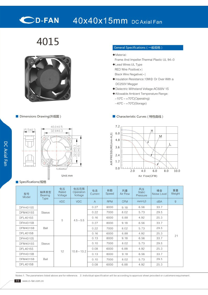 材料: 框架和葉輪:熱塑UL 94-0 引線.UL類型 紅色導(dǎo)線正極(+) 黑線負(fù)極(-) 絕緣電阻:10MΩ或以上,帶DC250V高阻表 介電耐壓:AC500V 1S 允許環(huán)境溫度范圍: -10℃-+70℃(運行) -40℃-+70℃(儲存)