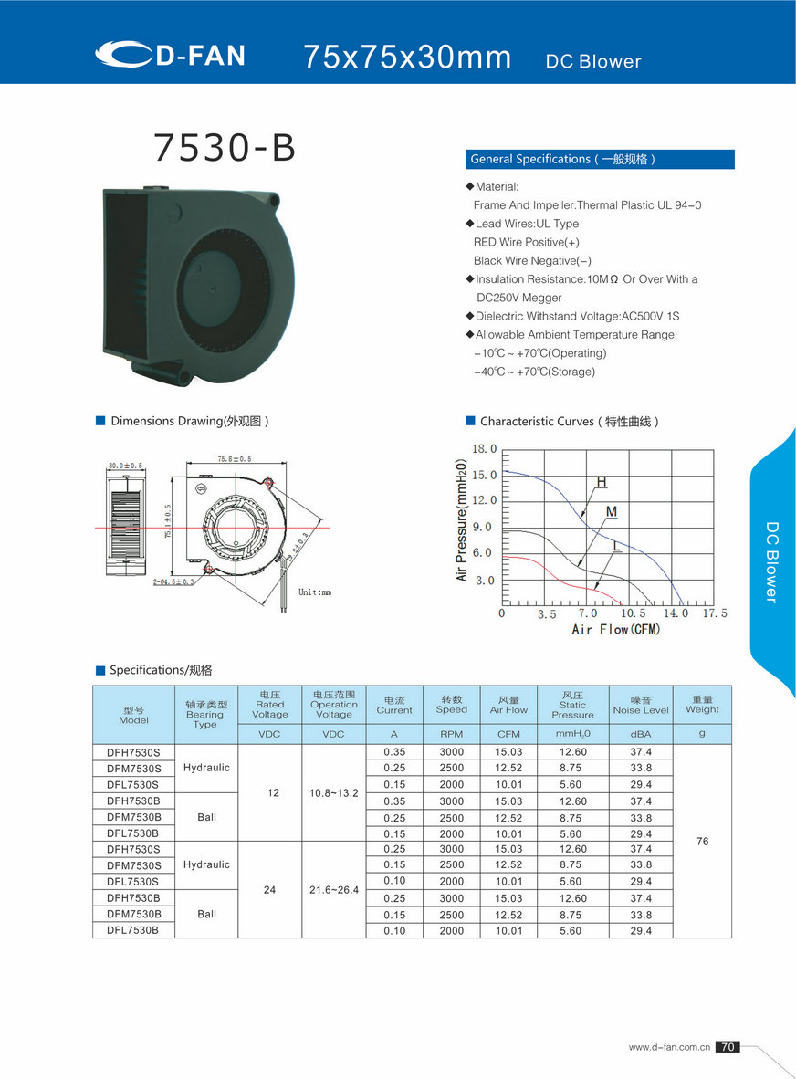 材料: 框架和葉輪:熱塑UL 94-0 引線:UL型 紅線正極(+) 黑線負極(-) 絕緣電阻:10MΩ或以上,帶DC250V高阻表 介質(zhì)耐壓:AC500V 1S 允許環(huán)境溫度范圍: -10℃~+70℃(運行) -40℃~+70℃(儲存)